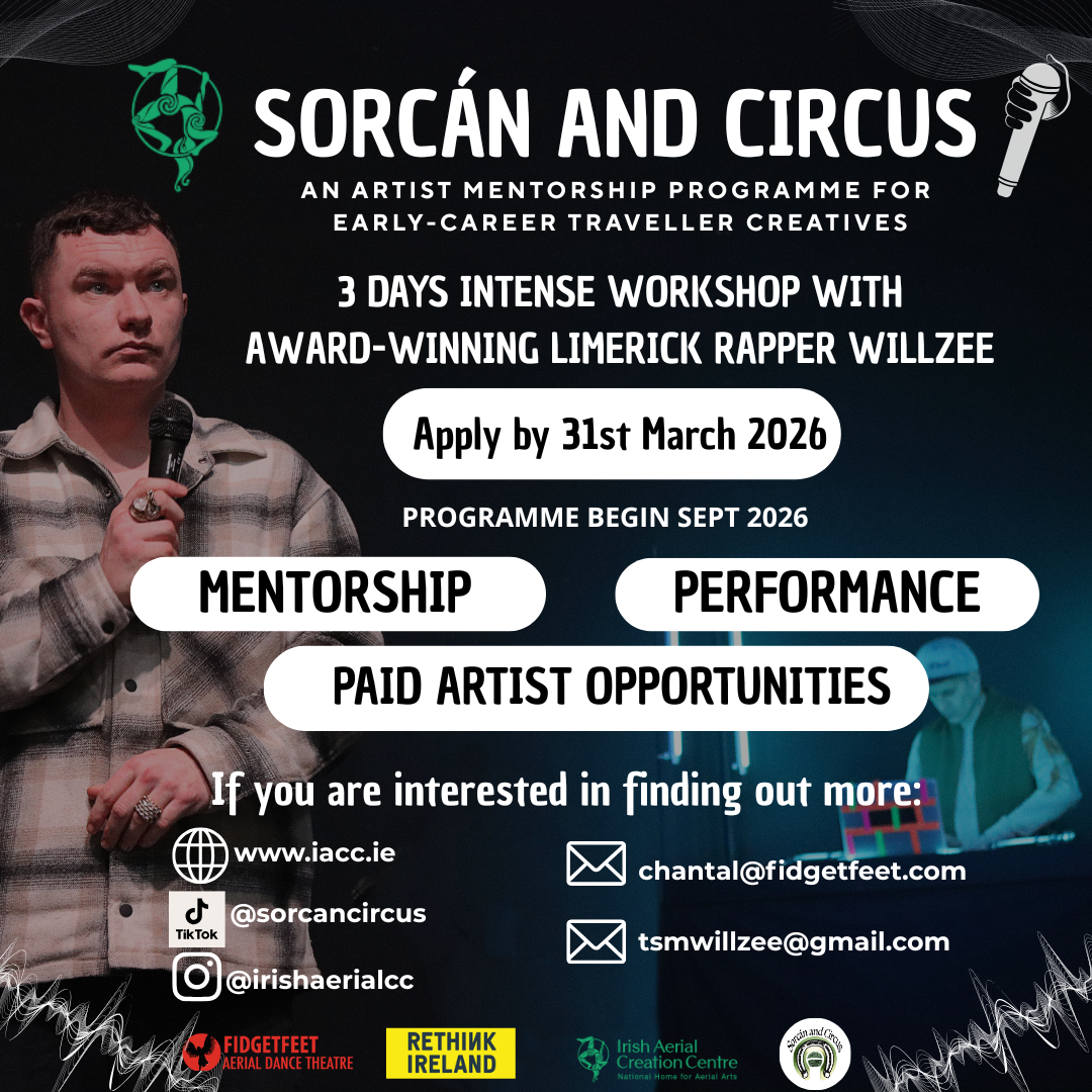 Sorcán & Circus is a new community engagement programme developed by WILLZEE and the Irish Aerial Creation Centre, rooted in Fidget Feet’s circus theatre production H.O.M.E.The programme centres Traveller voices, creativity, and cultural expression, working with early-career Traveller creatives through mentorship, performance, and paid artistic opportunities.